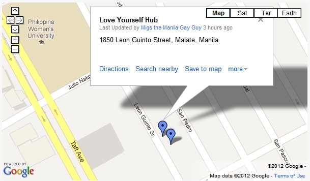 The LoveYourself Hub now offers: Weekend Wellness for Men — free and confidential testing for HIV, Syphilis, Hepa B, and other Sexually Transmitted Infections, in a safe and affirming place for men who like men. Starting June 9, 2012, it is open every Saturday and Sunday, 9 AM to 3 PM. Address for the Love Yourself Hub is 1850 Leon Guinto St., Malate, Manila.