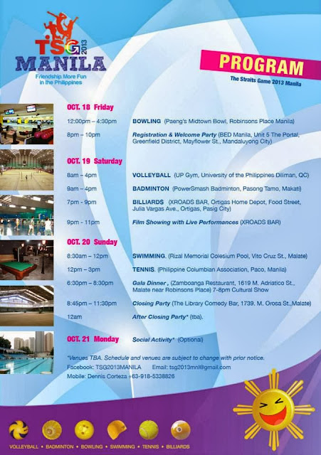 For the Straits Games 2013 Manila, attendees will compete across six events: volleyball, badminton, bowling, tennis, billiards and swimming.